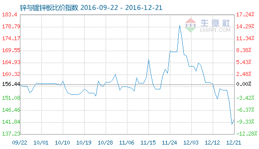 12月21日鋅與鍍鋅板商品比價(jià)指數(shù)為142.97,較昨日上升了1.89點(diǎn),較周期內(nèi)更高點(diǎn)179.56點(diǎn)(2016-11-28)下降了20.38%,較2012年06月28日更低點(diǎn)96.53點(diǎn)上漲了48.11%。(注:周期指2012-01-01至今)
